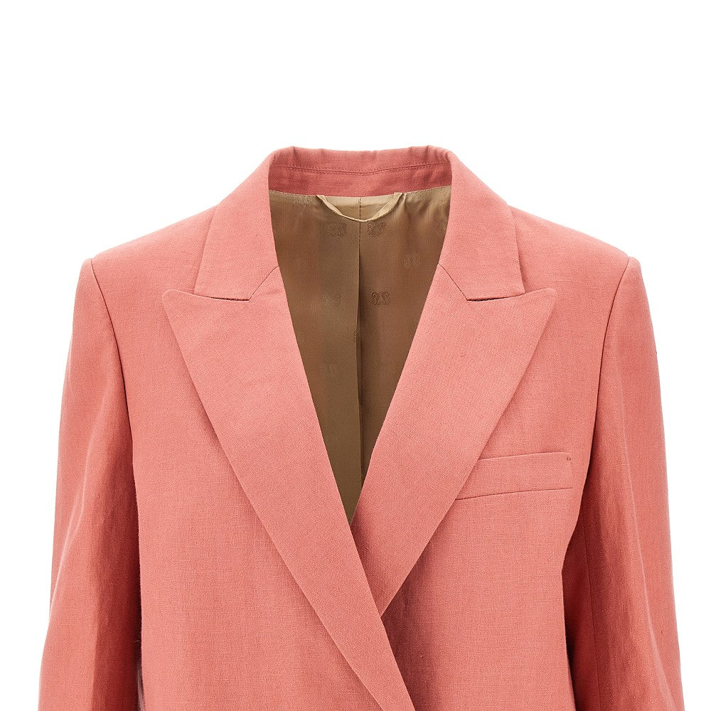 Blazer in tela di puro lino, caratterizzato da chiusura doppiopetto con bottoni effetto tartarugato. Revers a lancia, iconiche tasche laterali Smiley, tasca sul petto, fondo manica con bottoni e spacchi sul retro. Fodera in viscosa. Silhouette leggermente oversize con spalle imbottite