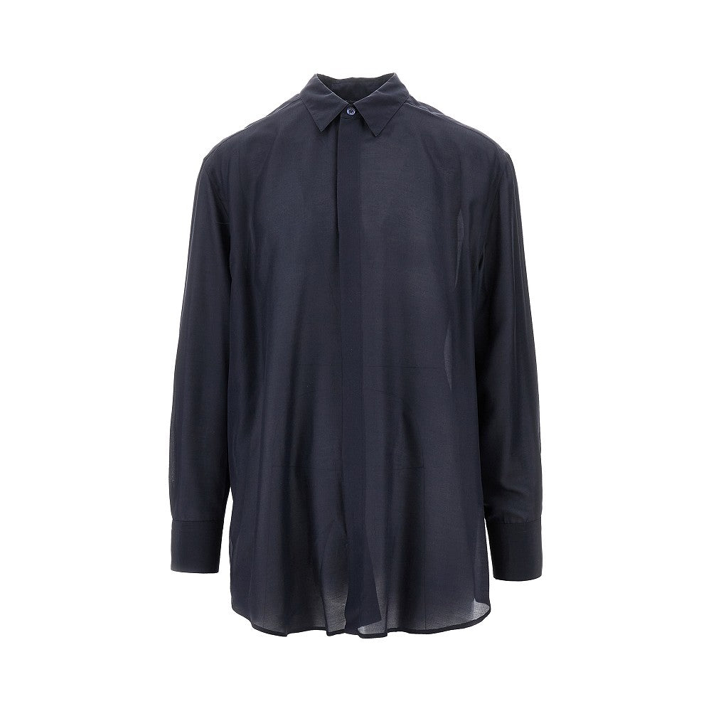 Camicia realizzata in leggero tessuto di misto seta e lyocell semitrasparente. Colletto classico a punta, chiusura con bottoni a scomparsa e polsini con bottoni. Vestibilità rilassata.