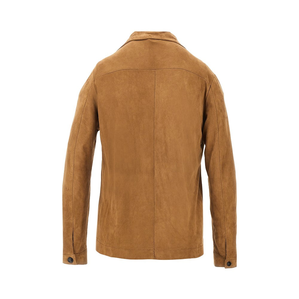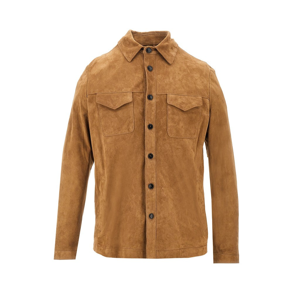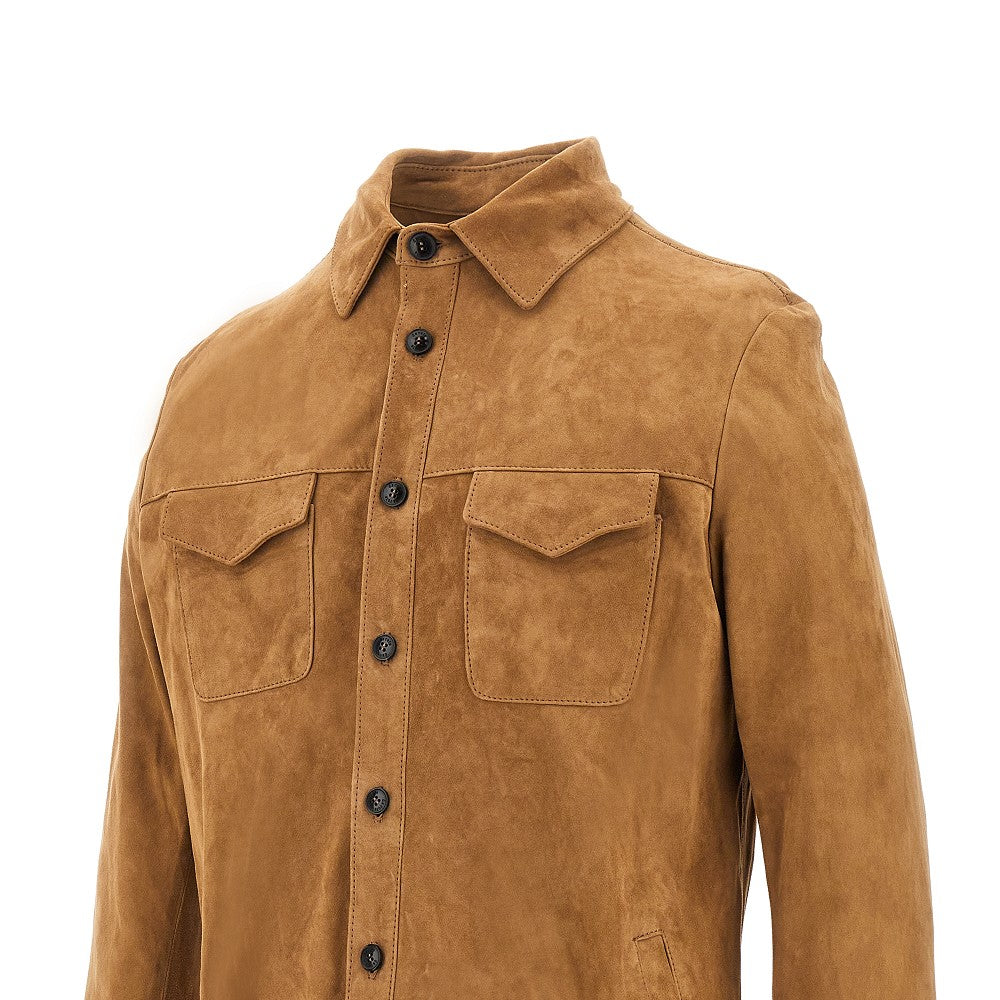 Camicia realizzata in morbida pelle scamosciata. Chiusura con bottoni, colletto classico a punta, fondo manica con bottone, tasche laterali a filetto e tasche a toppa sul petto con pattina. Vestibilità regolare.