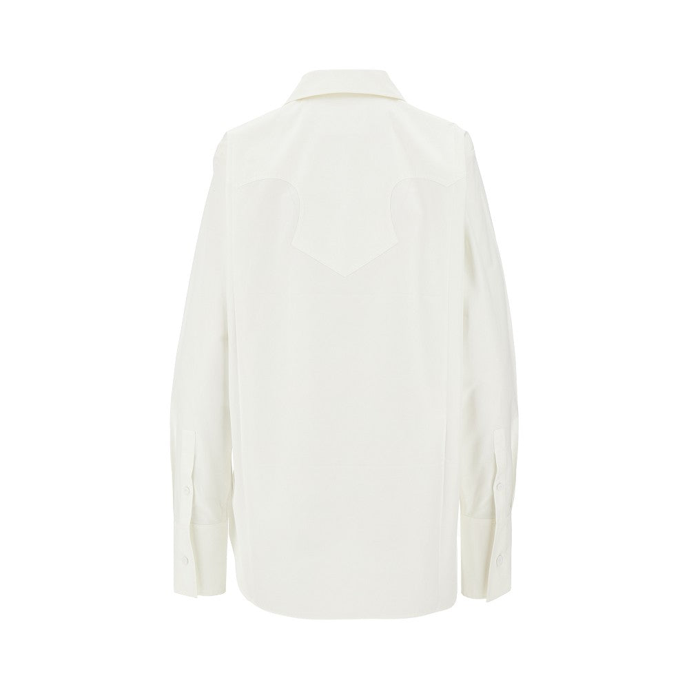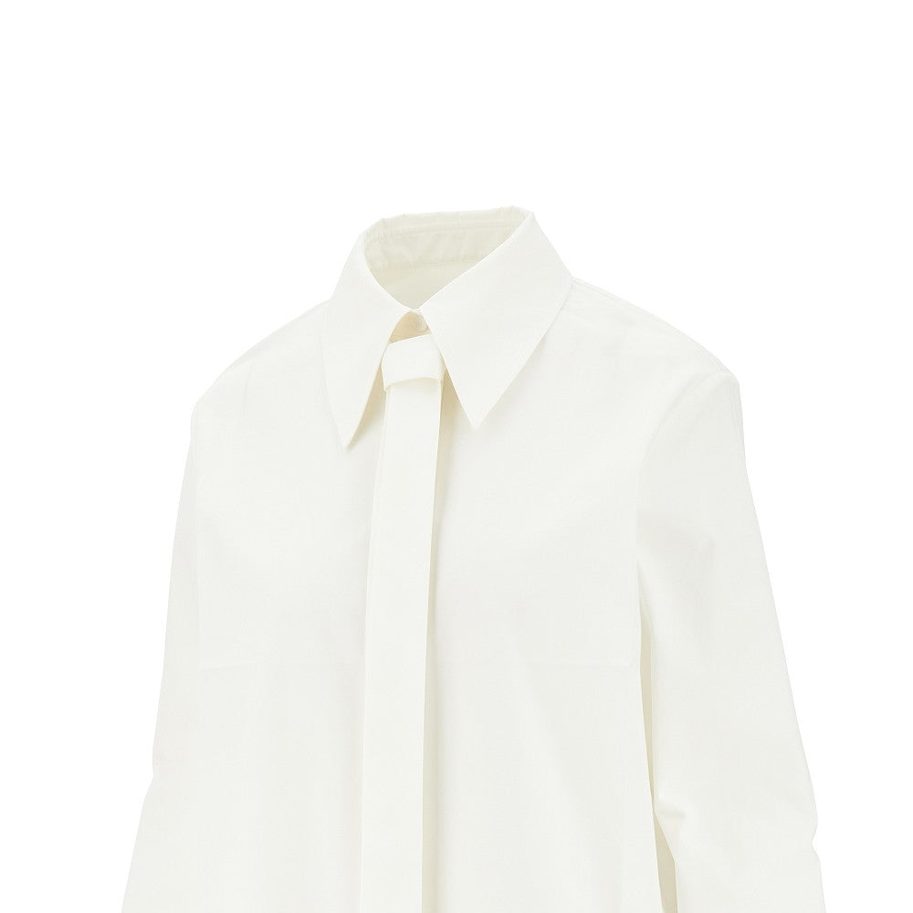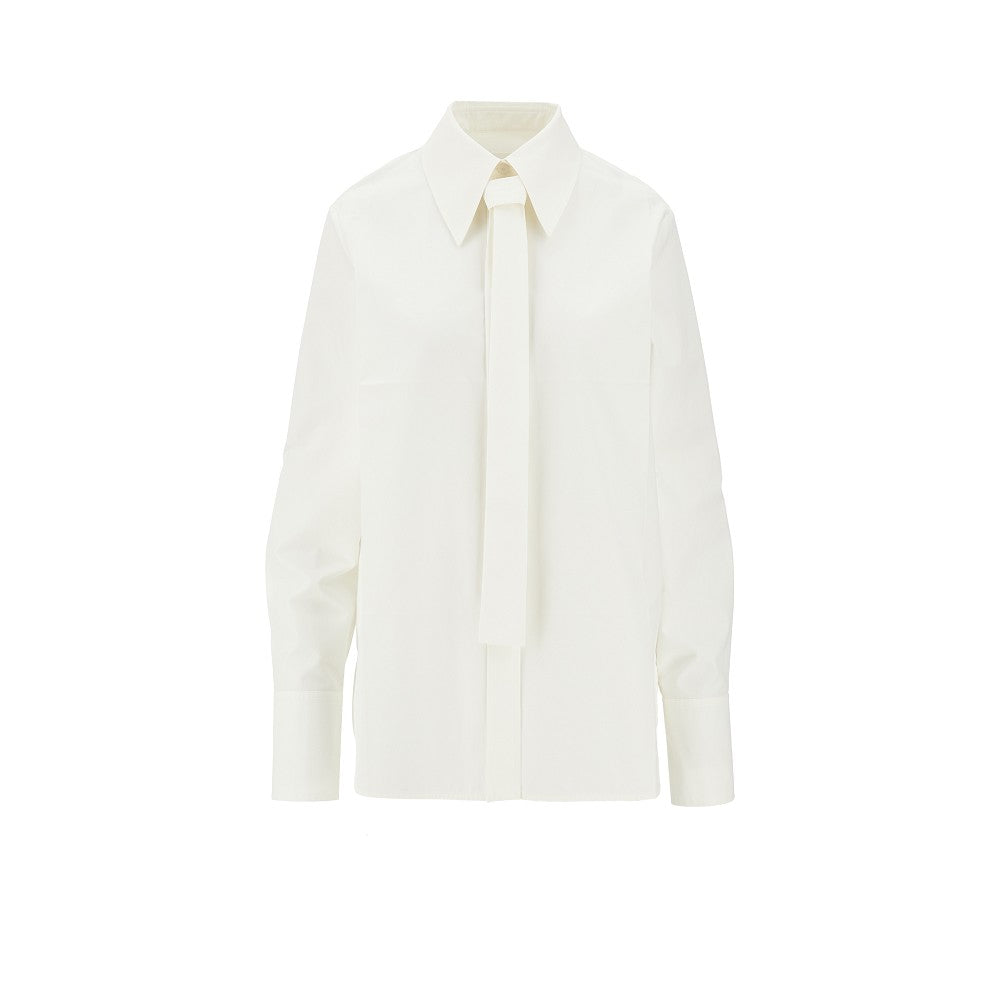 Camicia realizzata in popeline di cotone pesante, accessoriata di cravatta coordinata removibile. Colletto a punta, chiusura con bottoni rivestiti, ampi polsini con bottone, carré stile Western sul retro e orlo arrotondato. Taglio morbido con spalle leggermente scese.