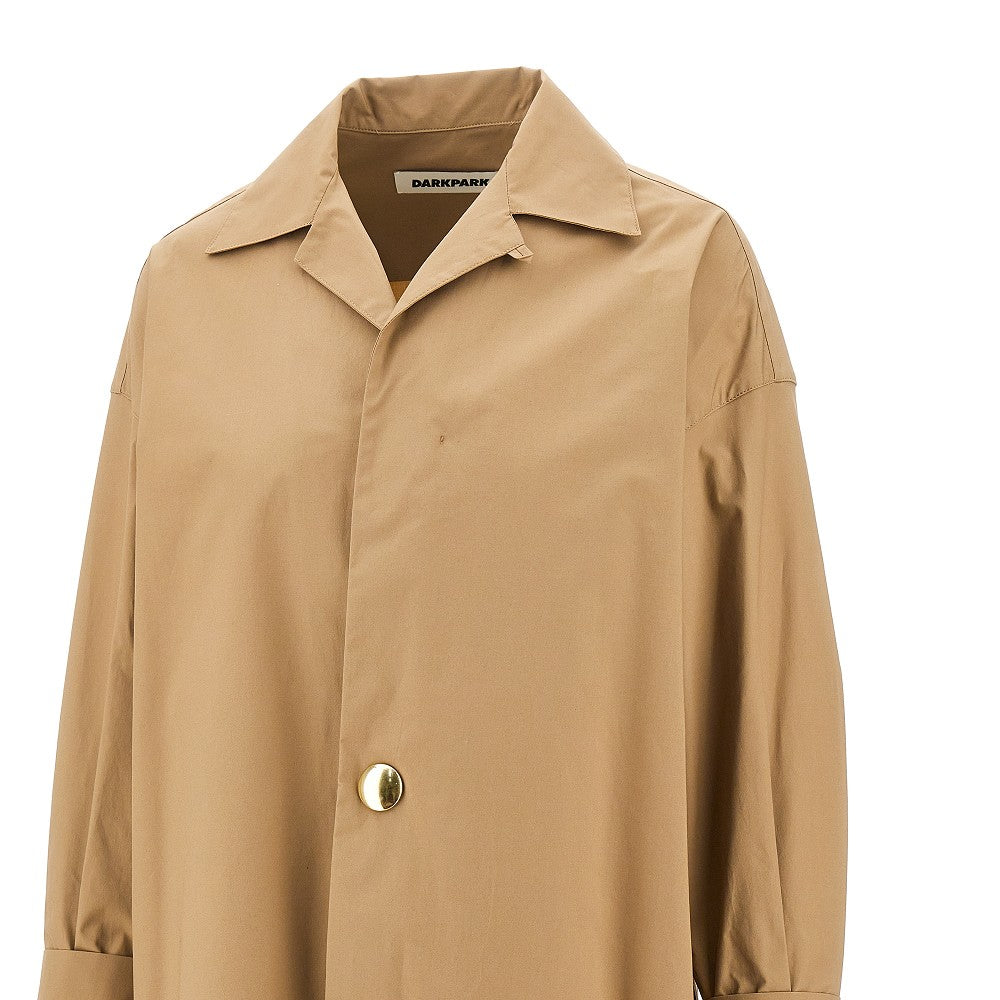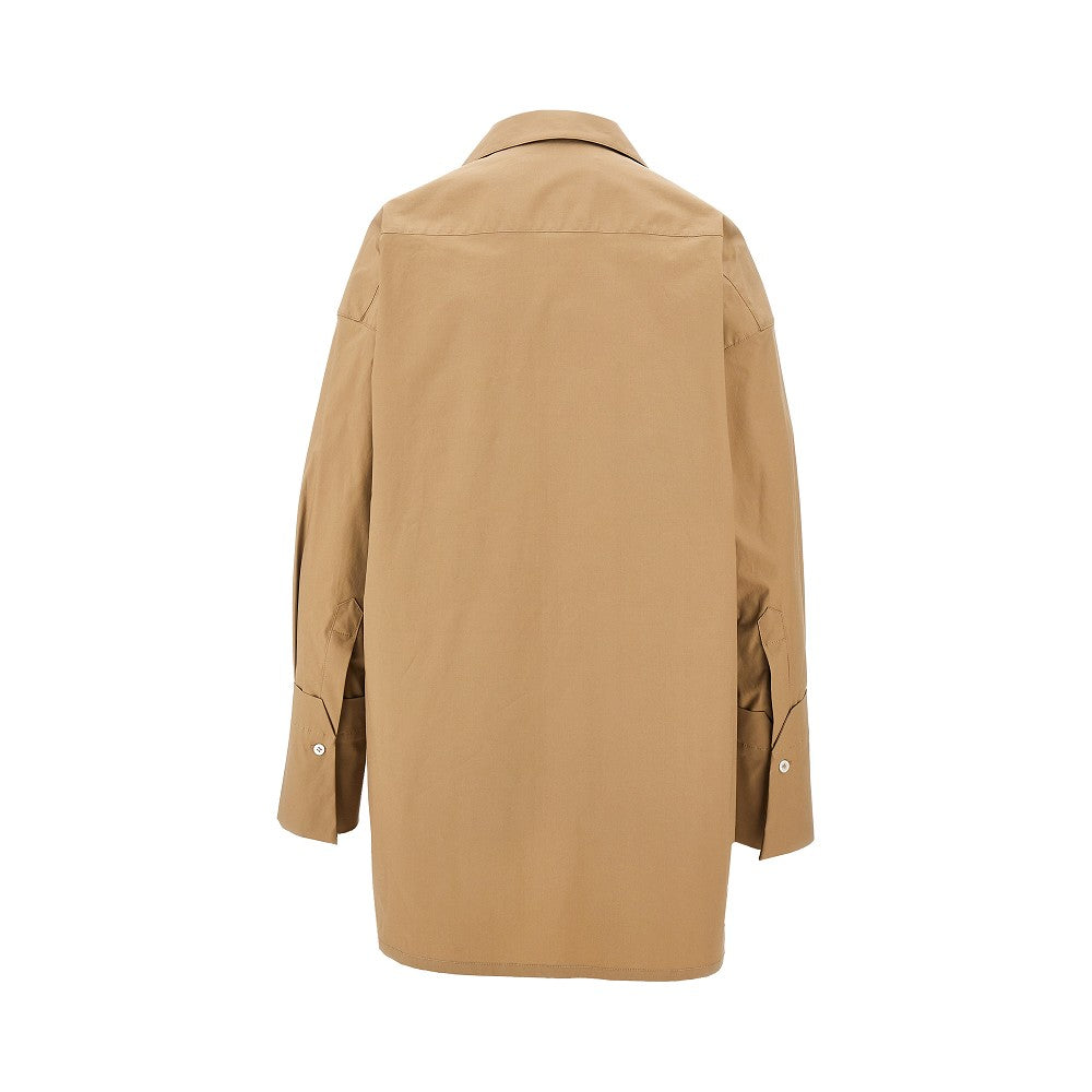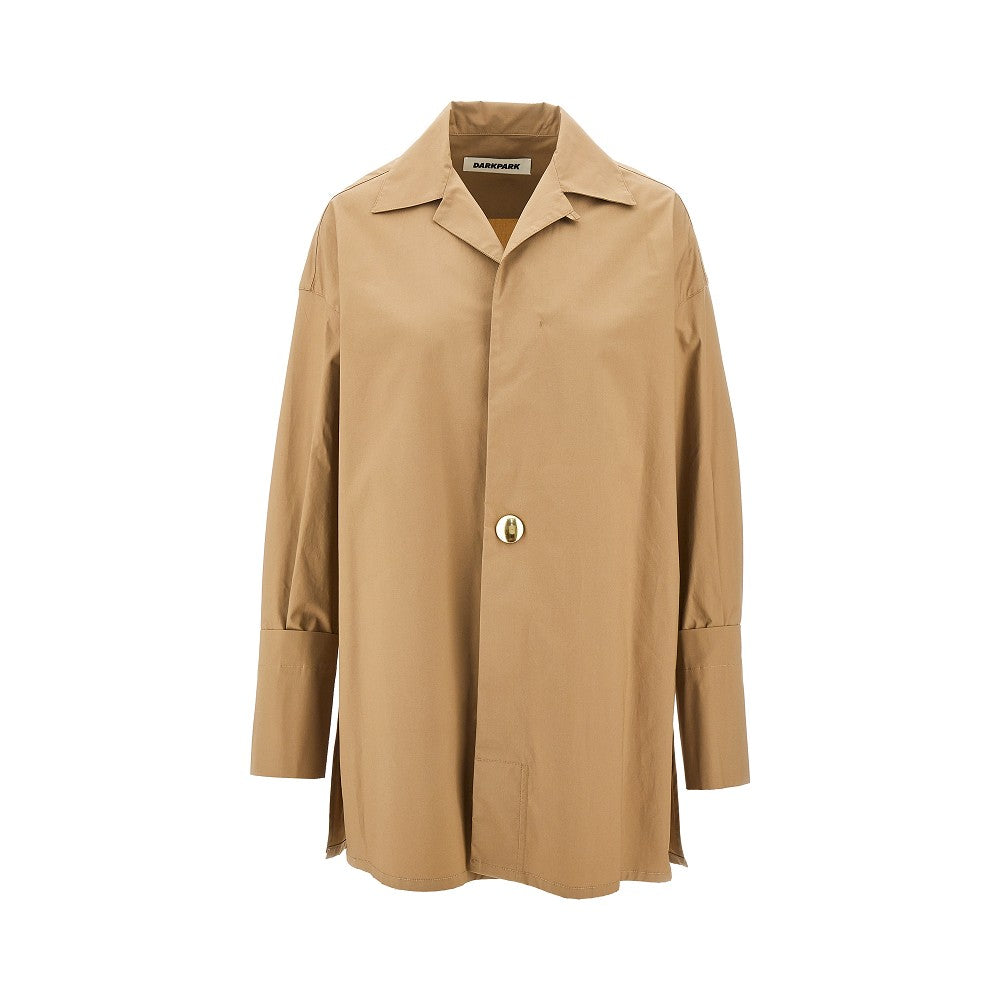 Camicia in popeline di cotone, caratterizzata dalla chiusura frontale con un bottone a pressione in metallo dorato e un bottoncino a scomparsa per regolare la scollatura. Colletto classico a punta con piccoli revers. Polsini alti con bottone in madreperla. Silhouette oversize con spacchi laterali.