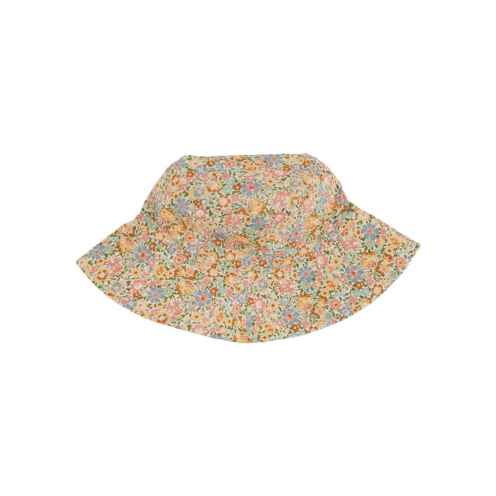 Cappello a secchiello realizzato in tessuto Liberty di puro cotone con motivo floreale. Falda impunturata. Fodera in twill di cotone.