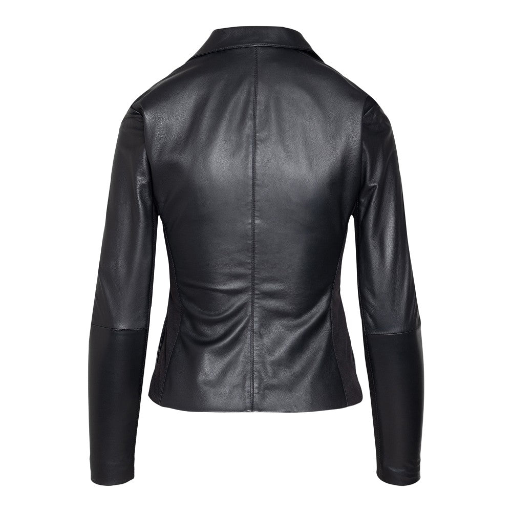 Giacca realizzata in morbida nappa di agnello con chiusura asimmetrica con zip a doppio cursore e inserti laterali in jersey stretch. Tasche laterali a filetto con bottone a pressione a scomparsa. Vestibilità slim. Foderata.