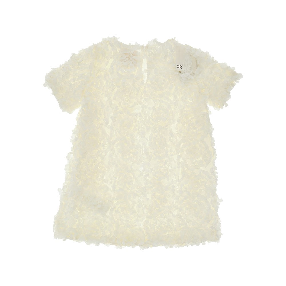 Abitino a manica corta realizzato in tulle con fiorellini in tessuto applicati all-over. Girocollo con chiusura a goccia con bottoncino sul retro. Fodera in cotone.