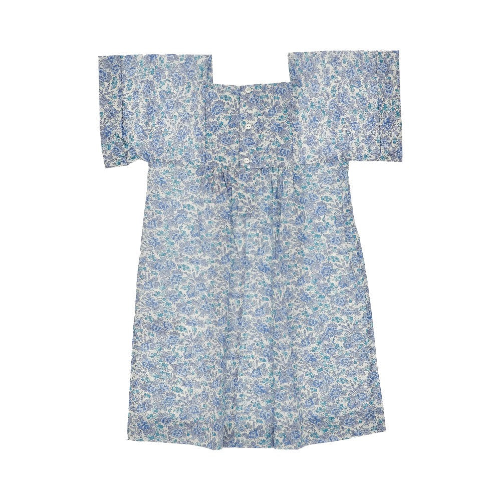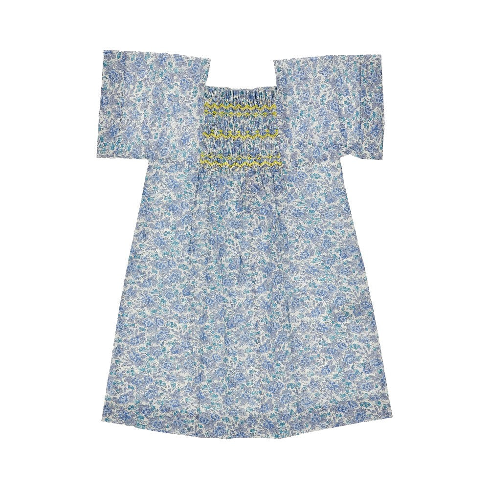 Abitino realizzato in tessuto Liberty di cotone con motivo floreale, arricchito dalla lavorazione in punto smock sul davanti con motivo a zig-zag ricamato. Maniche corte con risvolto. Scollo squadrato. Chiusura con bottoni sul retro.