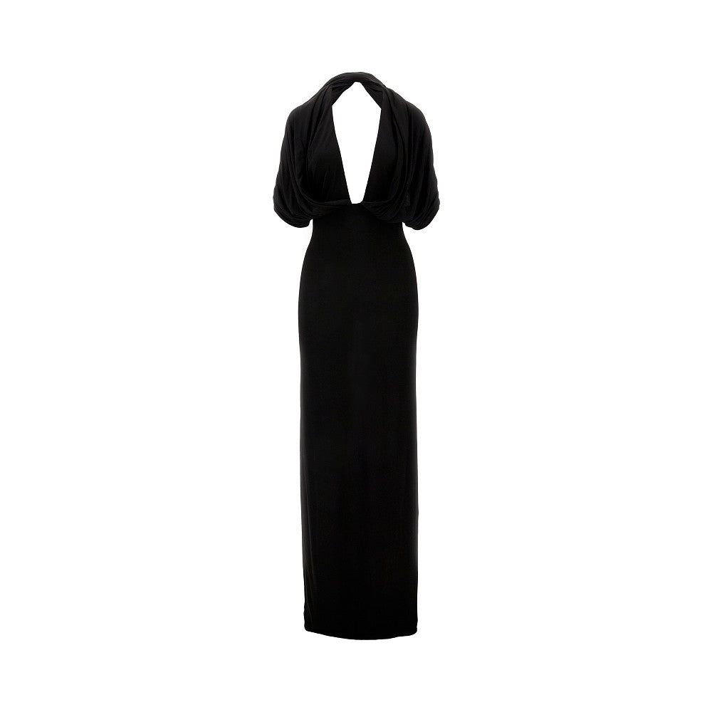 Abito lungo realizzato in jersey di viscosa elasticizzato, caratterizzato dallo scollo all'americana con schiena scoperta e profonda scollatura frontale dal design sciallato. Spacco laterale sul fondo. Elastico sul punto vita. Silhouette aderente dalla vita in giù. Sfoderato.