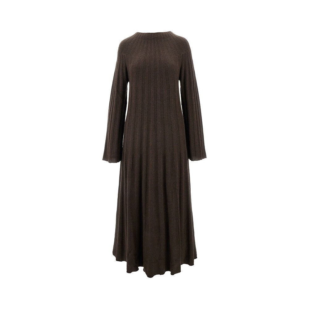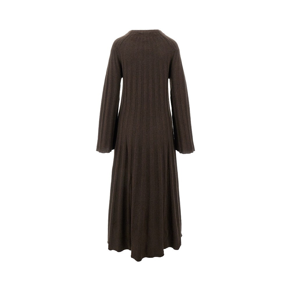 Abito alla caviglia a manica lunga realizzato in morbido filato di misto lana e cachemire con lavorazione a coste large. Silhouette regolare con spalle basse. Fondo capo e fondo manica svasati. Scollo a barchetta.