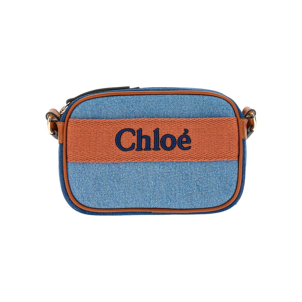 Borsa realizzata in denim di cotone organico con dettagli e tracolla regolabile in pelle, arricchita dal logo ricamato sul davanti. Tasca a fessura sul davanti. Chiusura con zip. Fodera in cotone.