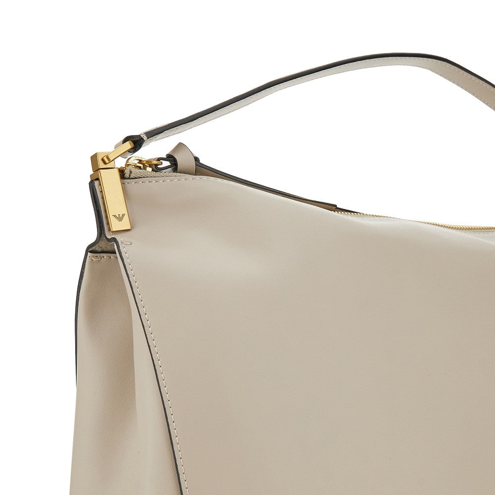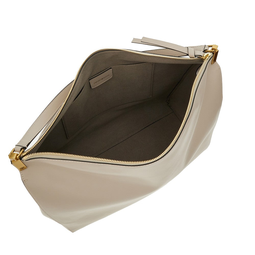 Borsa realizzata in morbida pelle liscia con manico da indossare a mano o a spalla. Logo "Emporio Armani Milano 1981" dorato stampato sul davanti. Chiusura con zip. Interno foderato in suedette con una tasca applicata. Accessori metallici con finitura oro.