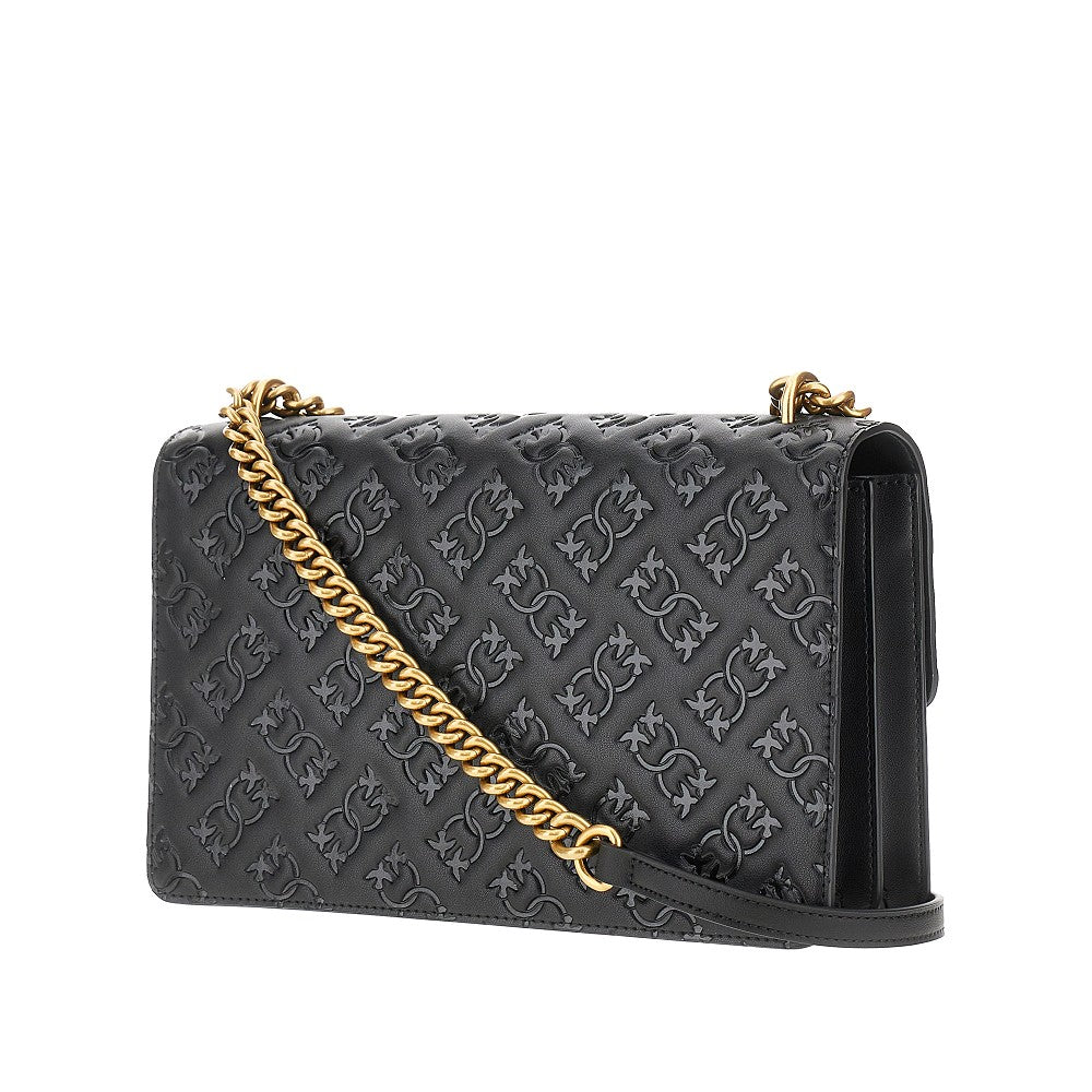 Borsa pelle con motivo Love Birds impresso caratterizzata da pattina con chiusura magnetica ad incastro con fibbia Love Birds in metallo finitura oro anticato. Tracolla scorrevole e regolabile in catena con inserti in pelle. Interno in suedette con due scomparti, una tasca applicata e una con zip.