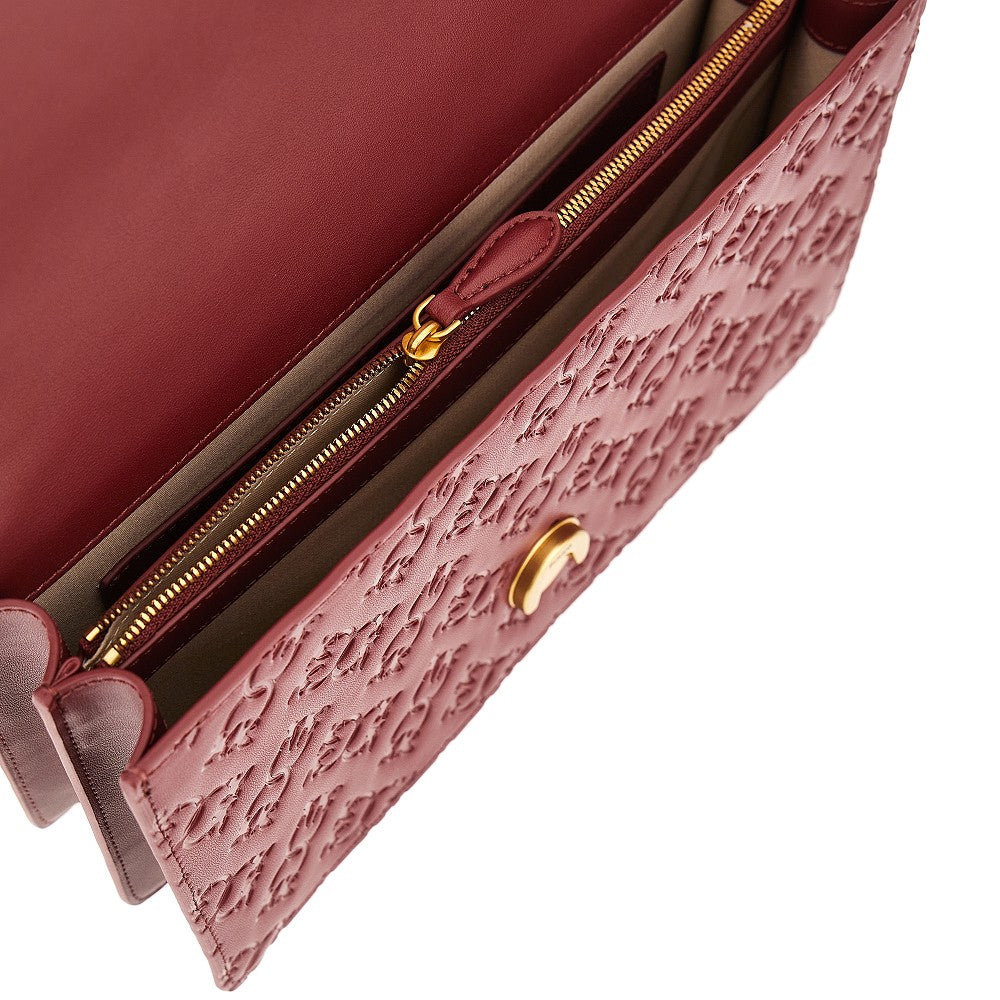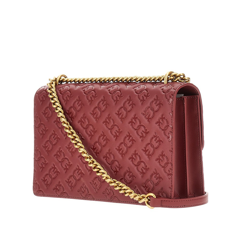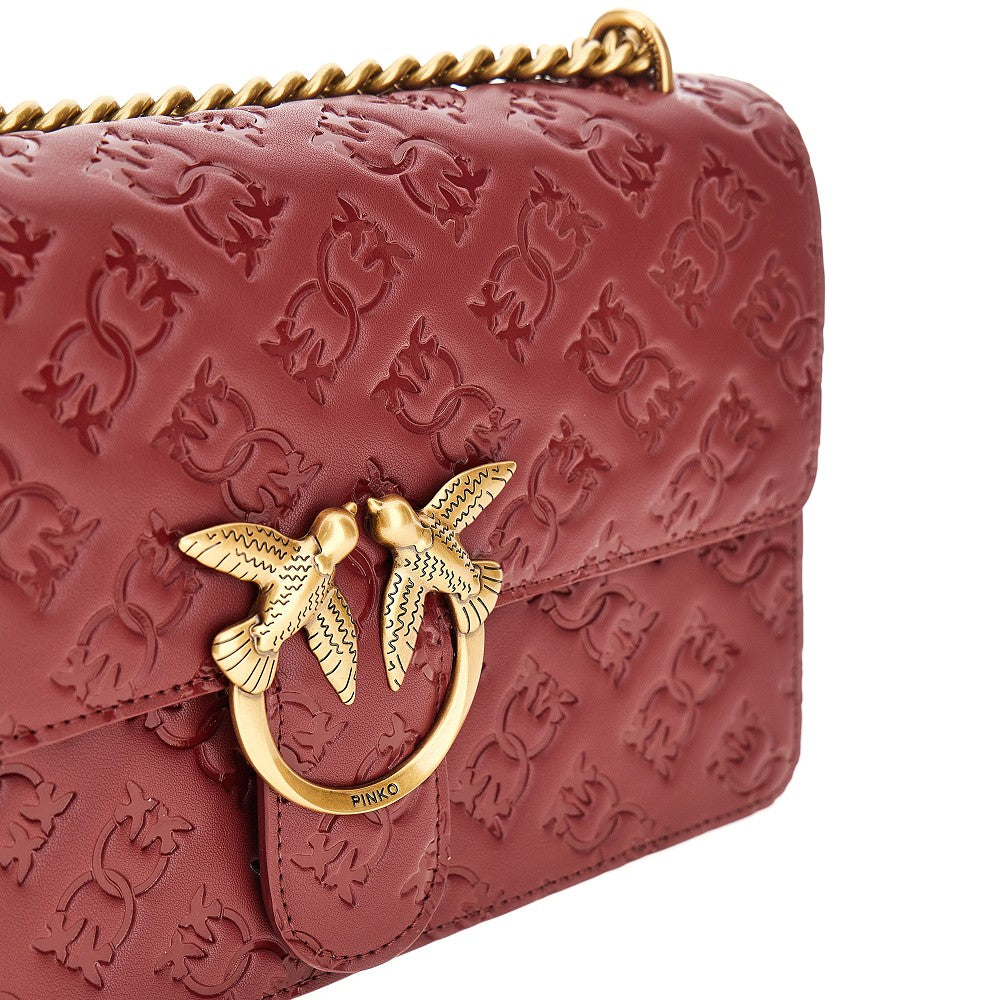 Borsa in pelle con motivo Love Birds impresso caratterizzata da pattina con chiusura magnetica ad incastro con fibbia Love Birds in metallo finitura oro anticato. Tracolla scorrevole e regolabile in catena con inserti in pelle. Interno in twill con due scomparti, una tasca applicata e una con zip.