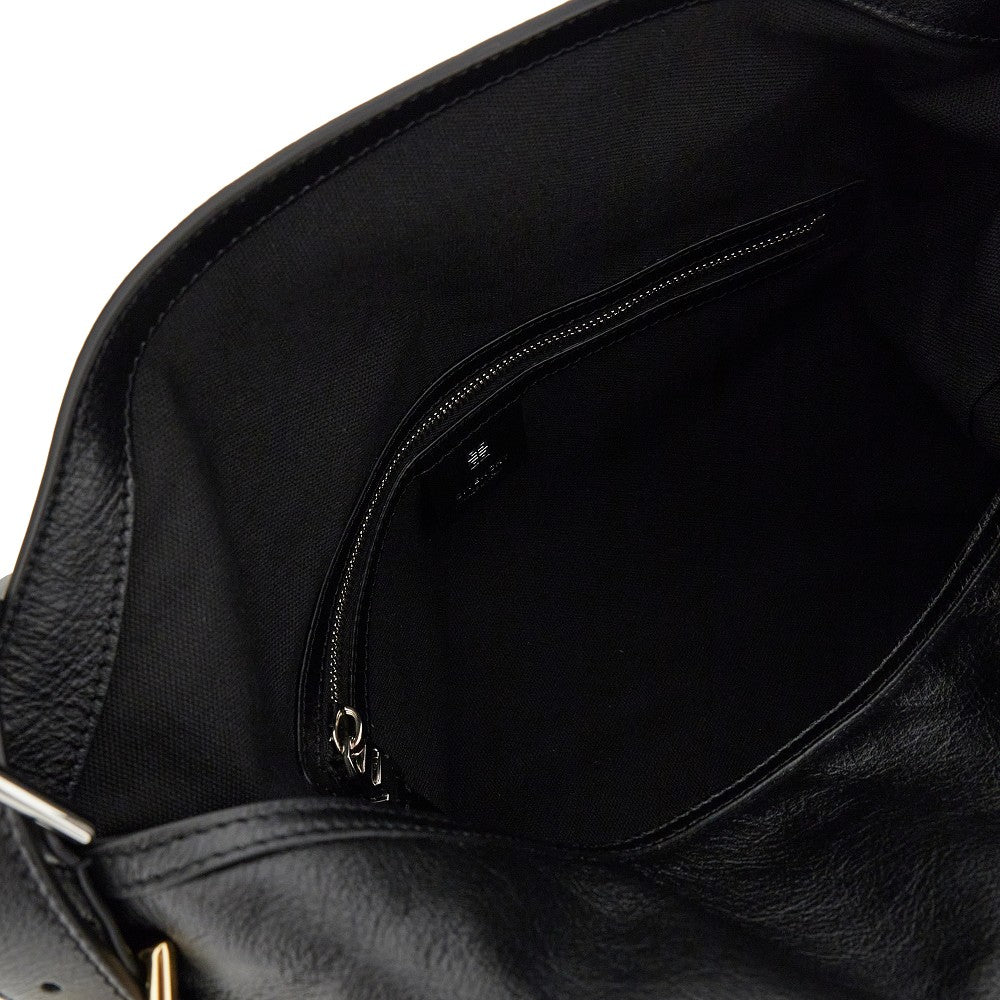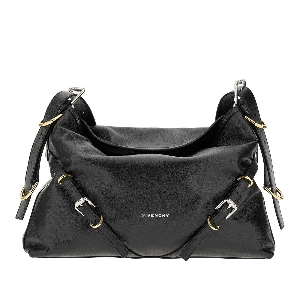 Borsa Voyoy media in morbida pelle leggermente bottalata, caratterizzata dai cinturini decorativi con fibbie e anelli in metallo finitura argento e oro. Tracolla con doppia regolazione. Logo lettering goffrato argento sul davanti. Interno foderato in twill con una tasca piatta con zip.