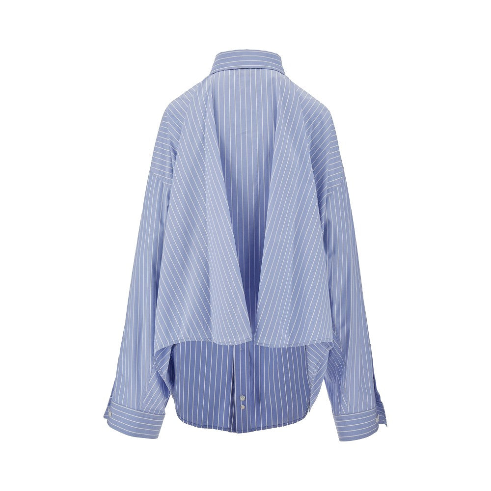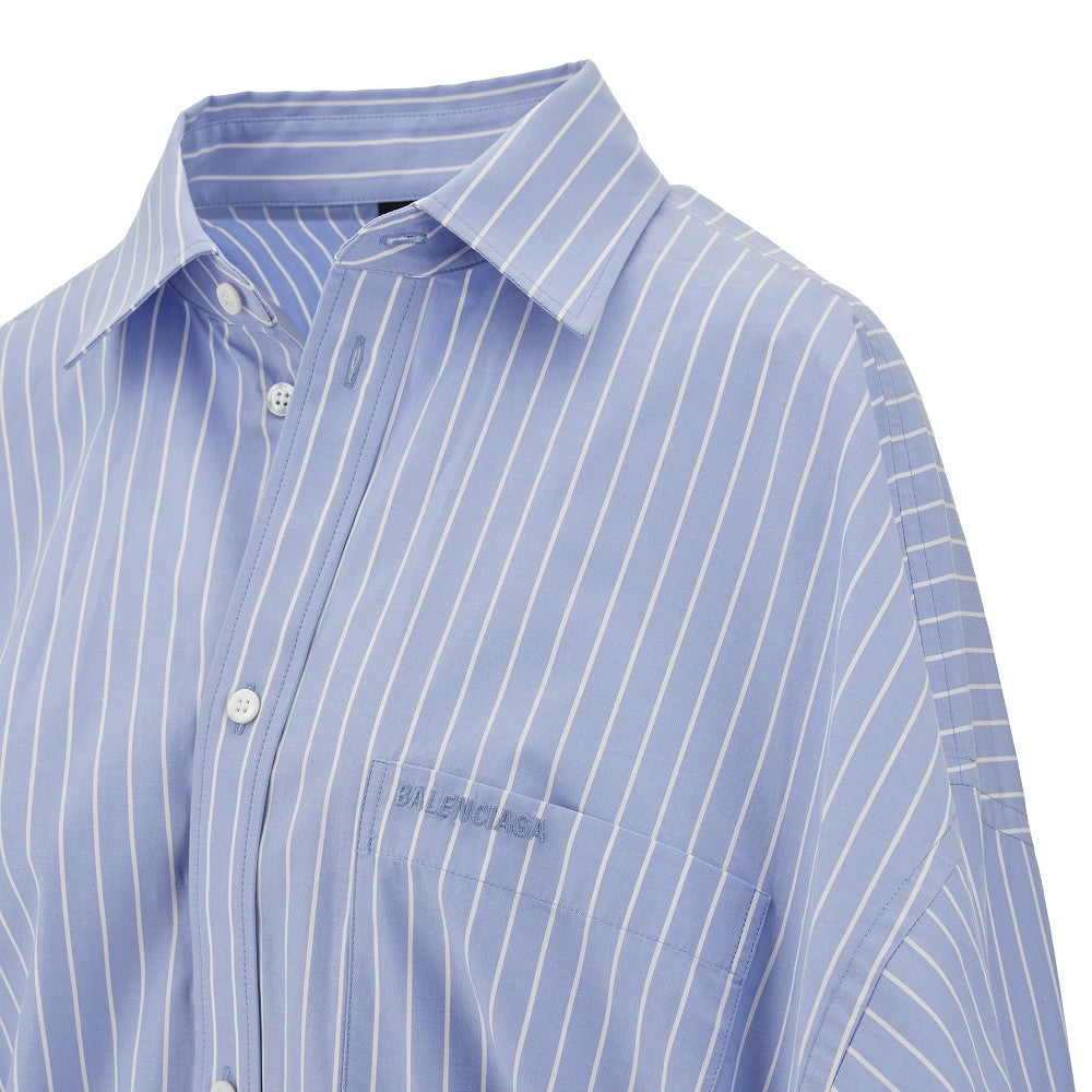 Camicia realizzata in popeline di cotone con motivo a righe, caratterizzata dalla silhouette oversize e asimmetrica con orlo frontale allungato e arrotondato. Colletto a punta, chiusura con bottoni in madreperla, polsini regolabili con bottone e tasca a toppa sul petto con logo ricamato.