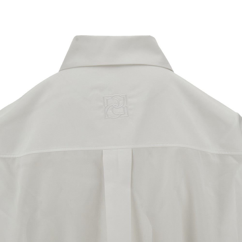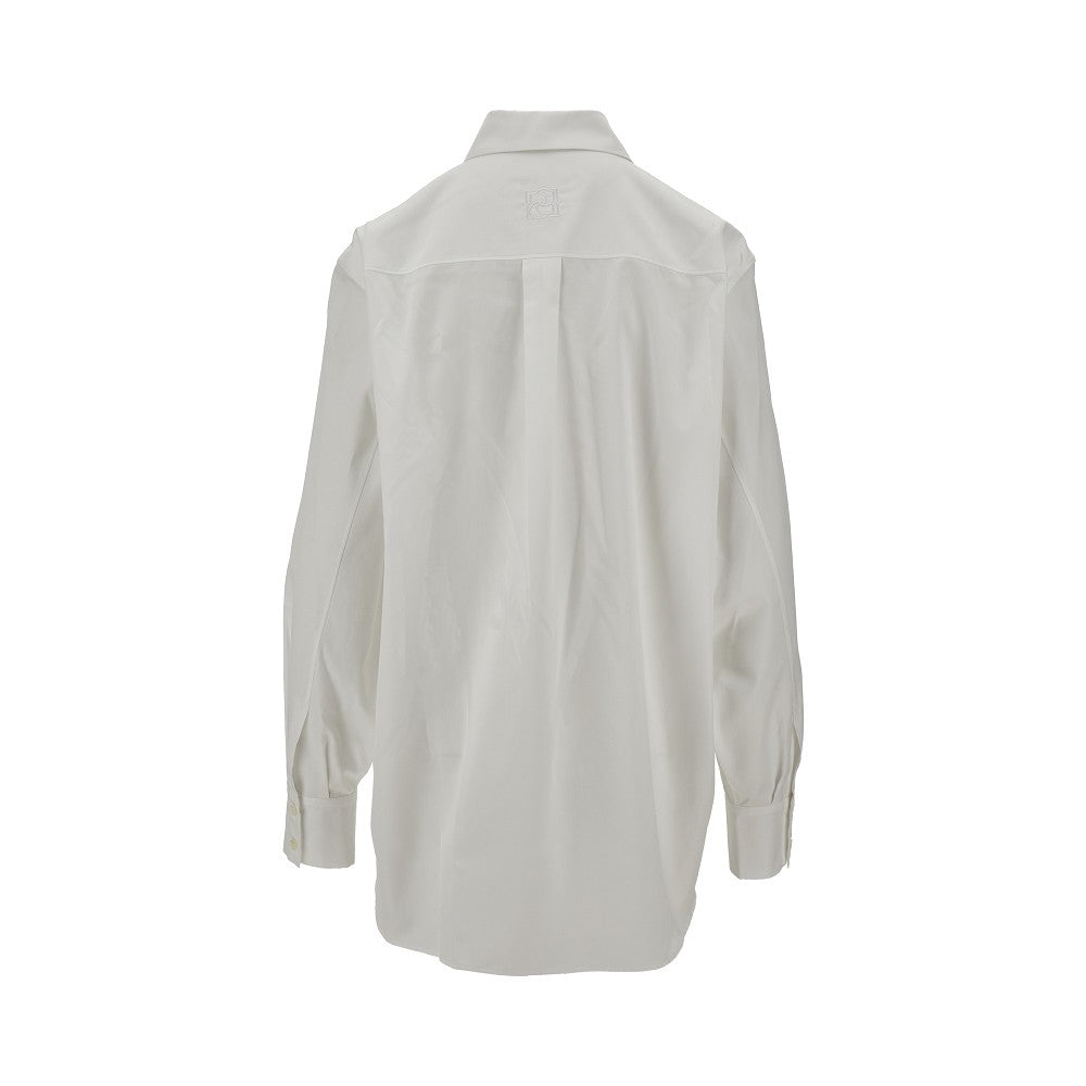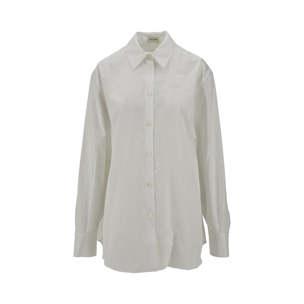 Camicia realizzata in morbido e lucido popeline di cotone, caratterizzata dalla silhouette oversize con giromanica ampio. Colletto a punta, chiusura con bottoni in madreperla e polsini a due bottoni.