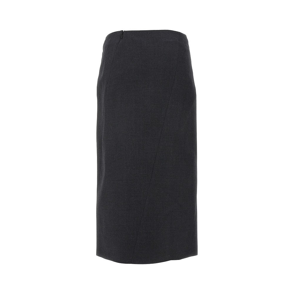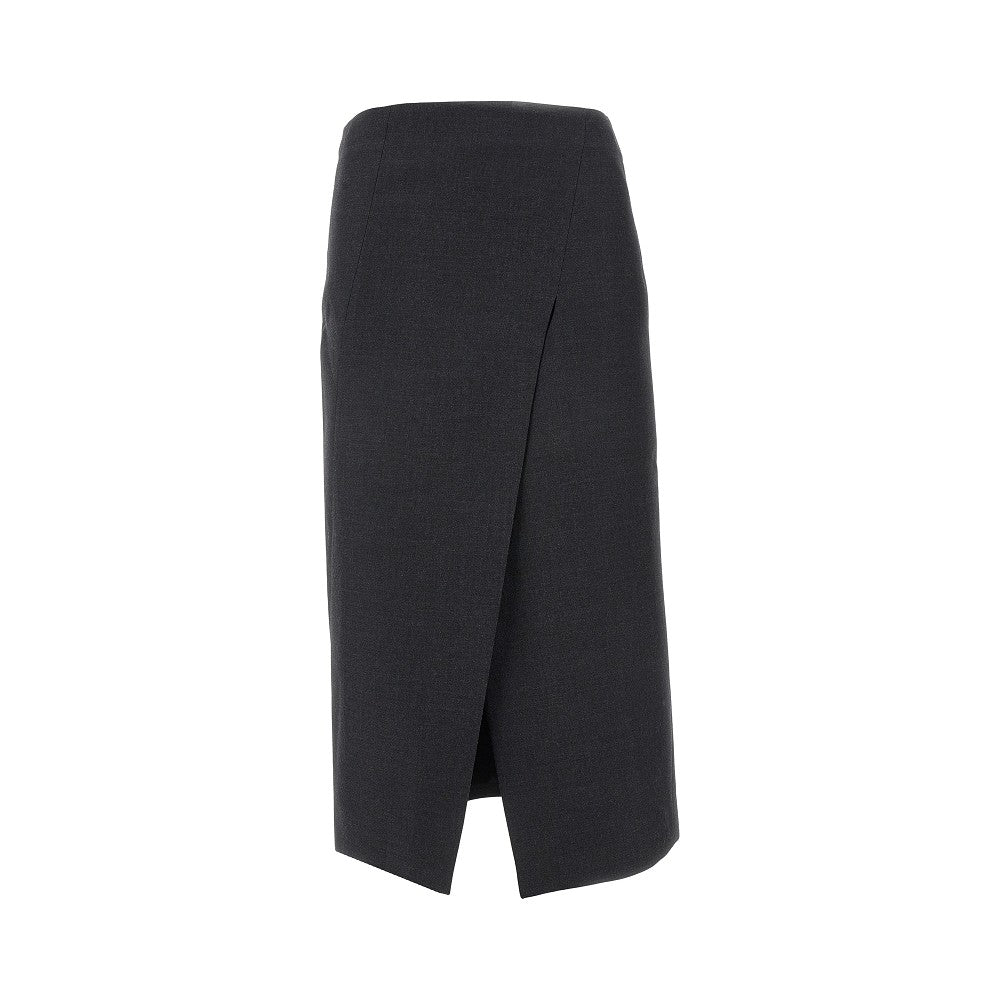 Gonna longuette realizzata in grisaglia di lana mélange, caratterizzata dallo spacco diagonale sul davanti. Silhouette dritta con vita bassa. Chiusura con zip e gancetto a scomparsa sul retro. Foderata.