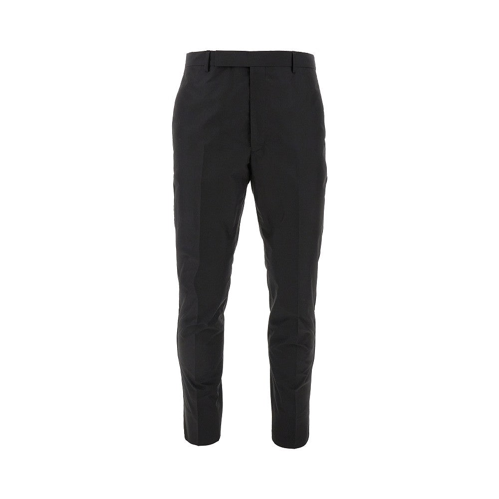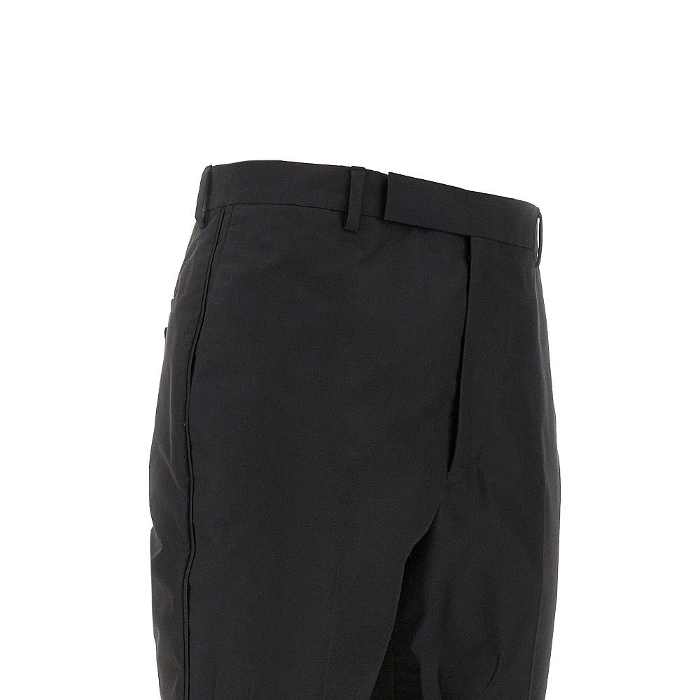 Pantalone in cotone tecnico, caratterizzato da una sottile banda in satin sui lati. Iconico patch triangolo nel medesimo tessuto applicato sul retro. Vita regolare con passanti, patta con zip e chiusura con gancetti e bottone a scomparsa. Tasche a filetto sui fianchi e sul retro. Vestibilità slim.