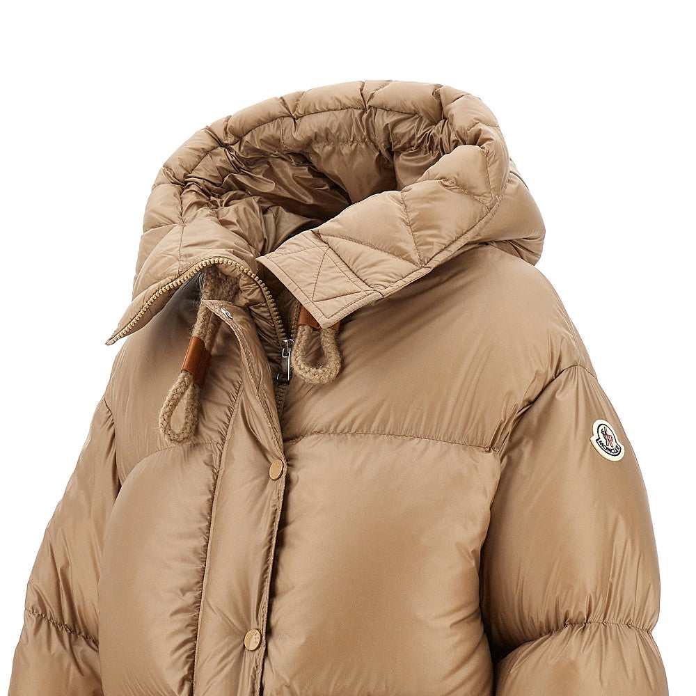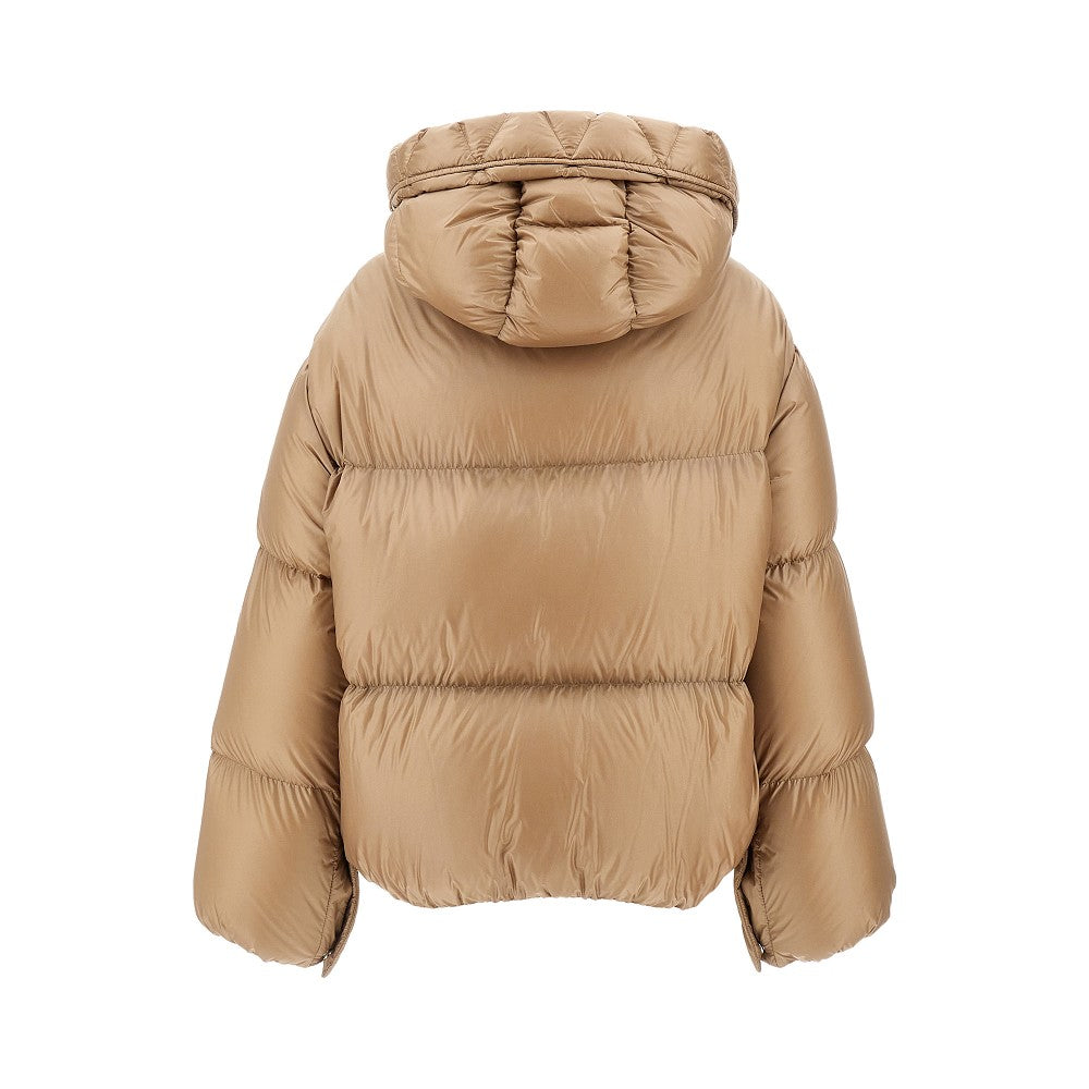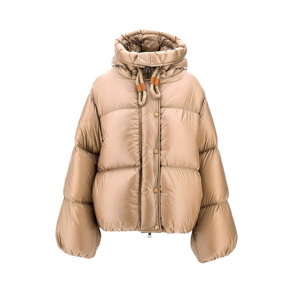 Piumino corto in nylon longue saison con imbottitura in piuma, caratterizzato dalle maniche che si aprono creando una mantella. Chiusura con zip a doppio cursore e bottoni a pressione. Cappuccio con coulisse in corda. Tasche laterali a filetto. Patch logo sulla manica sinistra. Vestibilità ampia.