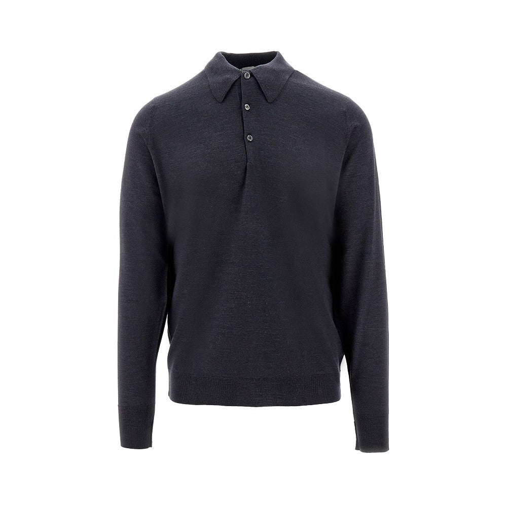 Polo a manica lunga in maglia realizzata in filato di pura lana merino extrafine mélange. Colletto a punta e chiusura con tre bottoncini. Polsini e fondo capo rifiniti in micro costine.