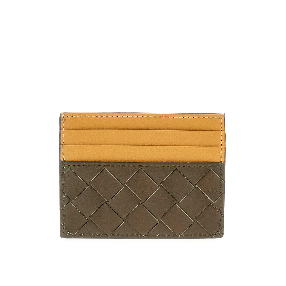 Portacarte realizzato in pelle bicolore e caratterizzato dall'iconica lavorazione Intrecciato. Tre slot portacarte su ogni lato e uno scomparto centrale a fessura.