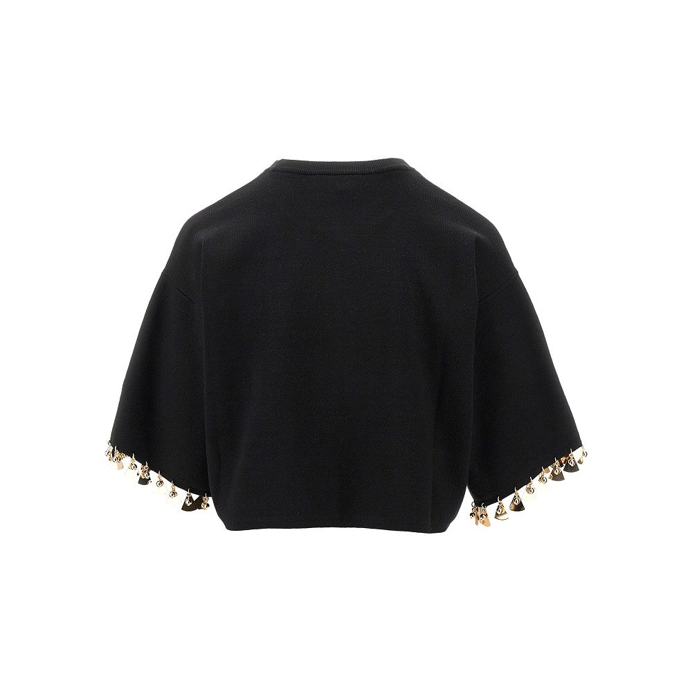 Pullover cropped realizzato in filato di misto seta e cotone elasticizzato, caratterizzato dalle maniche al gomito arricchite da dettagli pendenti in metallo finitura oro sul bordo. Girocollo rifinito in micro costine. Silhouette large con spalle scese.